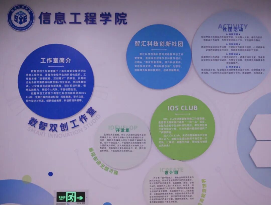 数智双创工作室隶属于上海东海职业技术学院信息工程学院,是面向全校学生的科技型组织。工作室本着“数智赋能,双创育才”的宗旨,长期企业合作开展各种科技创新/创业活动、学科竞赛活动,让全体成员启迪创新思维、探讨前沿科技、锻炼实践能力、展现个人风采、丰富校园生活。数智双创工作室下有智汇科技创新社团和IOS CLUB,主要开展的活动包括科技竞赛、学术交流软件设计与开发、创新创业教育、科技前沿讲座等。